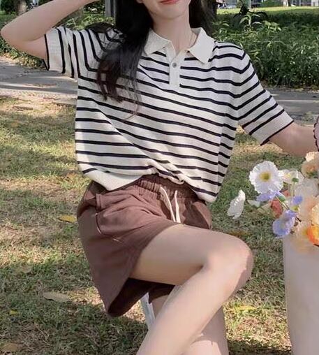 【women’s】Retro stripe short sleeve knit polo