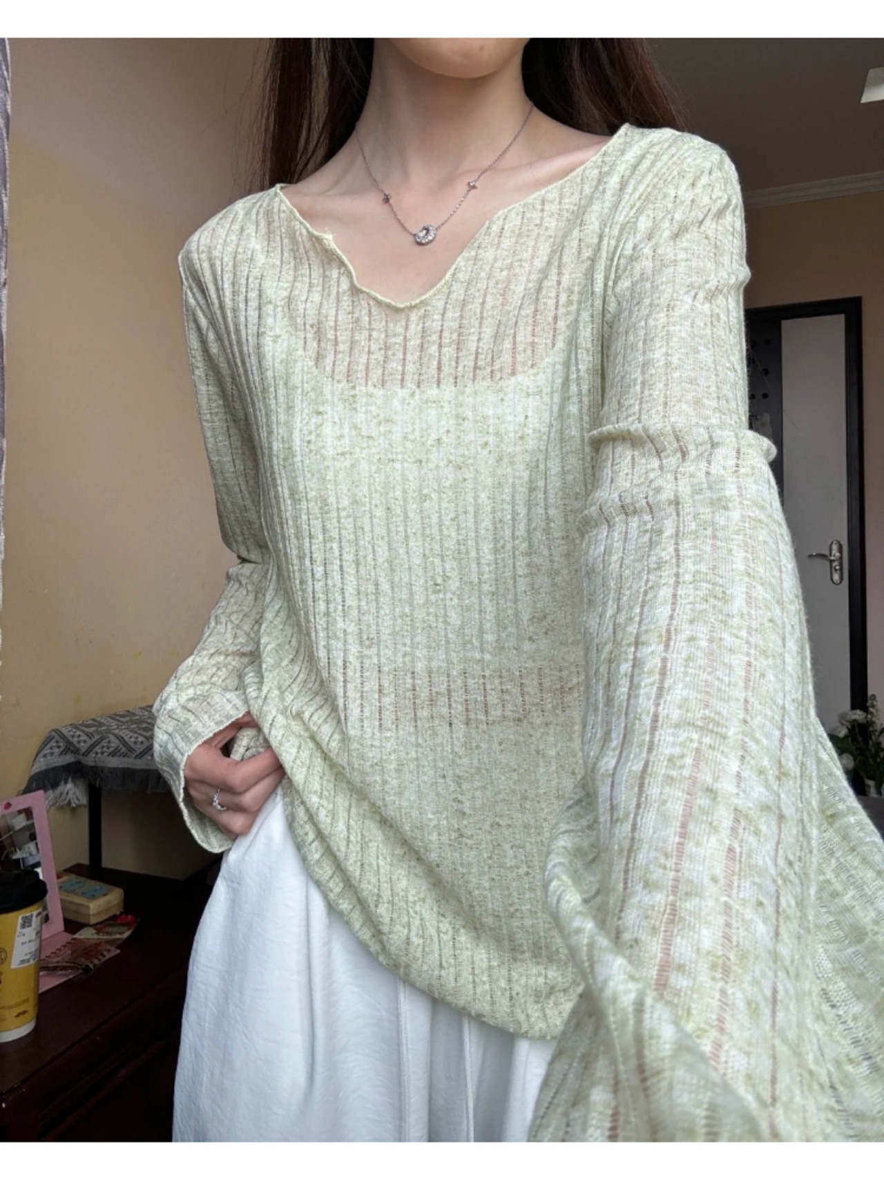 ほんのり透けるシアーライクな質感が、肌に軽やかに寄り添うVネックカットソー。