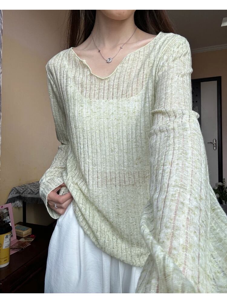 “透け感と光沢で魅せる、品のあるVネックカットソー”