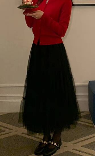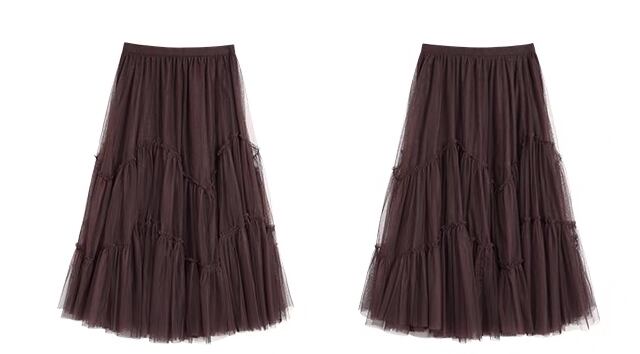 ふんわりと揺れる多段階デザインが美しい、メッシュ生地のロングスカート。
