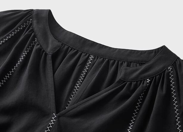 全体を引き締めるブラックボディに、ホワイトのジグザグステッチがアクセントとして映える一着。