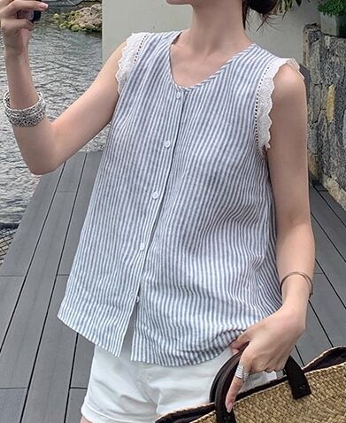 【women’s】Frill Sleeve Cotton Sleeveless Blouse – Summer Stripe Charm