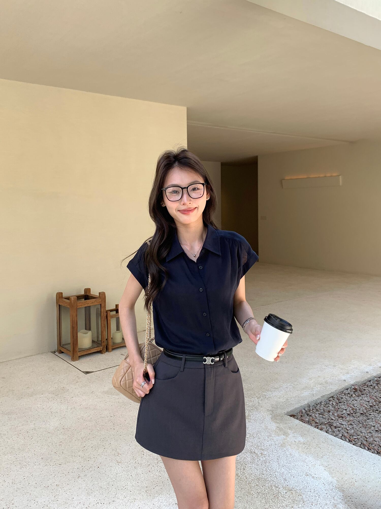 シンプルなショートスリーブブラウスは、きちんと感と抜け感を両立。